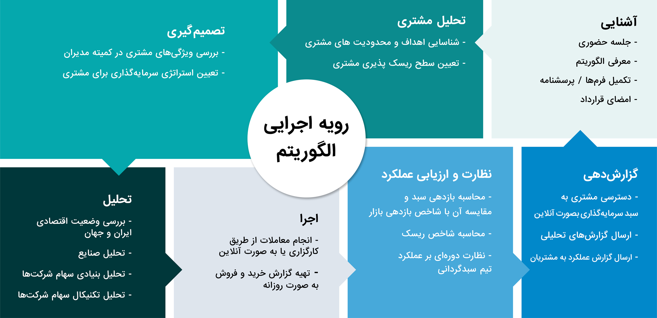 الگوریتم خدمات سبدگردانی اختصاصی را مطابق با چارچوبهای تعیینشده توسط سازمان بورس ارائه میکند. در این فرآیند ابتدا جلسه حضوری با مشتریان برگزار میشود و طی آن اطلاعات هر مشتری در قالب مجموعهای از فرمها و پرسشنامهها جمعآوری و تحلیل میشود. پس از تعیین اهداف سرمایهگذاری و میزان ریسکپذیری مشتری، استراتژیها و ترکیب بهینه سبد وی تعیین خواهد شد. با توجه به ماهیت بازار بورس، ترکیب این سبدها بهصورت دورهای مورد بازبینی قرار میگیرد.