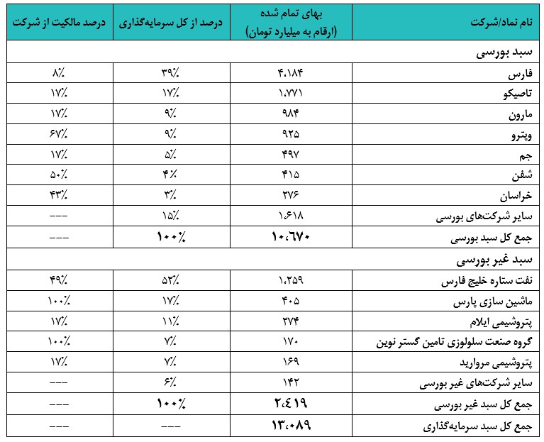 - ارزش سبد بورسی شرکت بر اساس ارزش روز و درصد تملک شرکتها برآورد گردیده است.